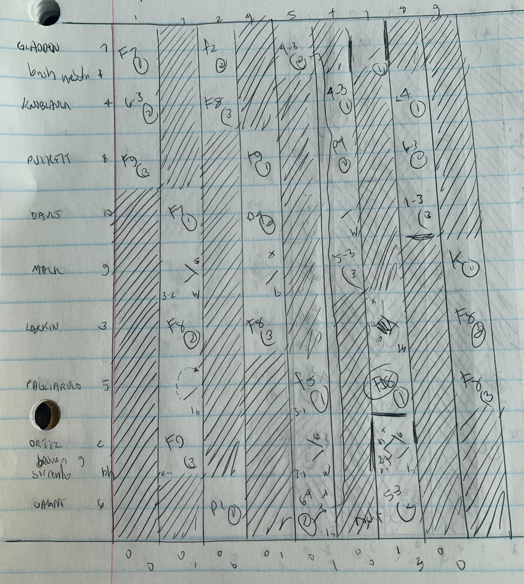 Jim loved to dig up old box scores and pose them as trivia, asking readers to identify the historical significance. In honor of his old columns, here is a box score from one of Jim’s very own notebooks. The date: Sept. 29, 1991. Scroll past the photo for the answer.