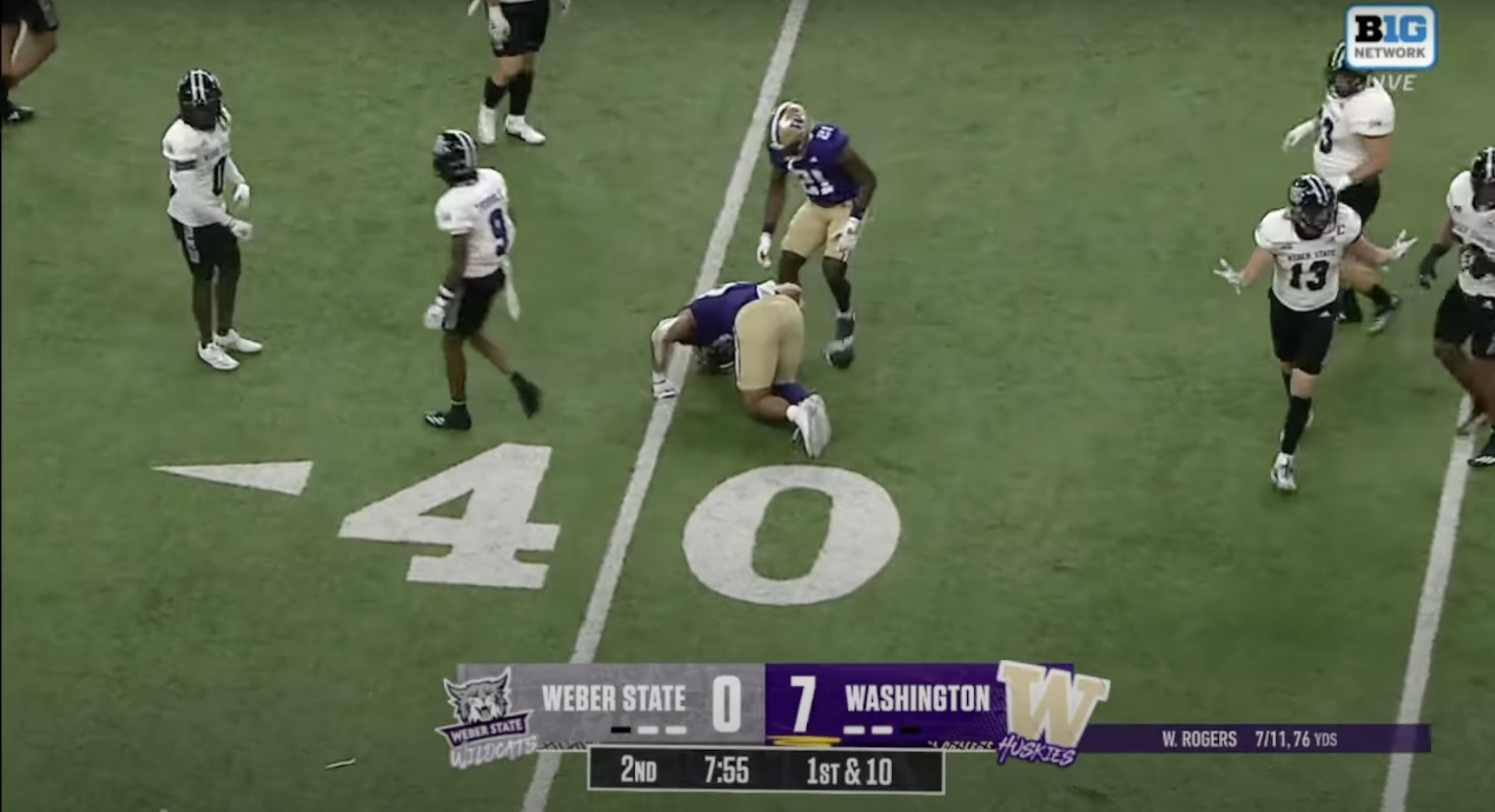 On second-and-six from the UW 34 yard-line, Will Rogers throws a quick screen to Giles Jackson, who gains eight yards to pick up the first down. The Huskies go up-tempo from there, moving quickly to snap the ball without substituting. Weber State, though, tries to make subs, and appears to be stuck with just 10 players on the field when UW snaps the ball with 29 seconds still on the play clock.