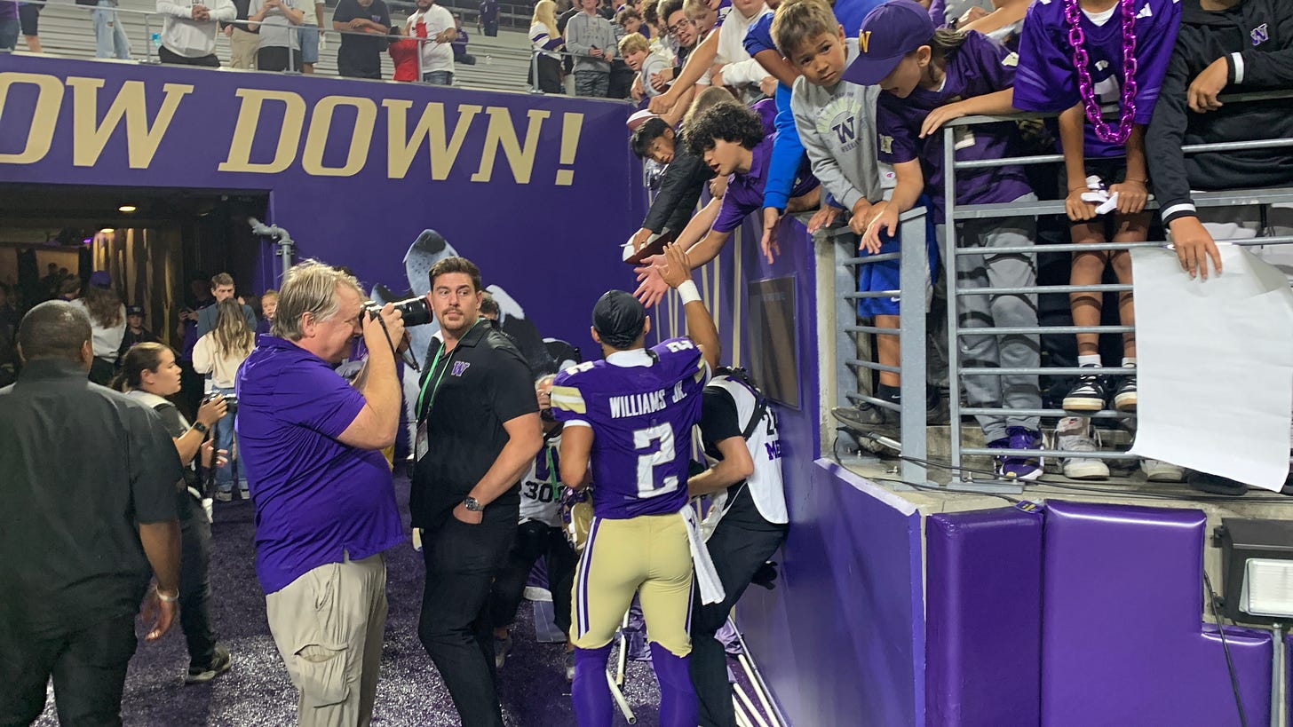 Hours later, Demond Williams Jr. was back in the same corner, children leaning over the railing and shouting his name, the college sophomore autographing a couple items before disappearing back toward the Huskies’ locker room.